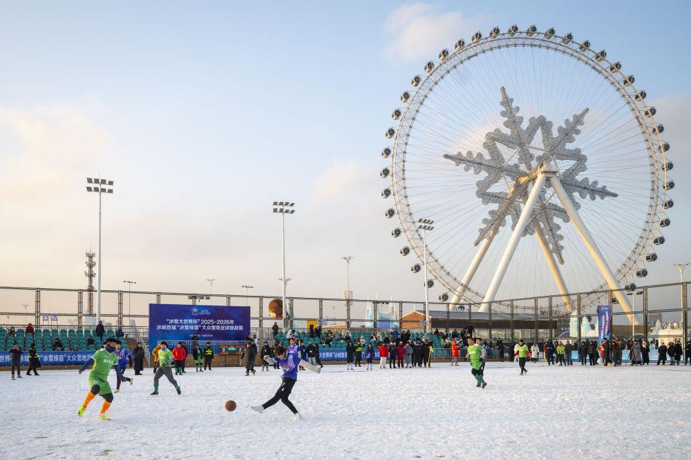 2025年12月20日,参赛球员们在哈尔滨市“冰超”系列冰雪赛事启动仪式暨“冰雪大世界杯”2025-2026年冰城首届“冰雪绿茵”大众雪地足球挑战赛中。新华社记者张涛摄