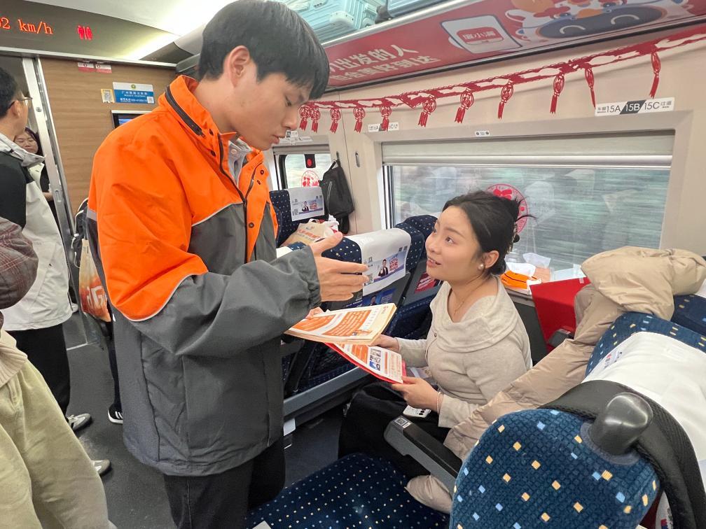 2月7日,G1136次列车上,湖北荆门的企业招聘专员向返乡人员介绍企业招聘情况。(受访者供图)
