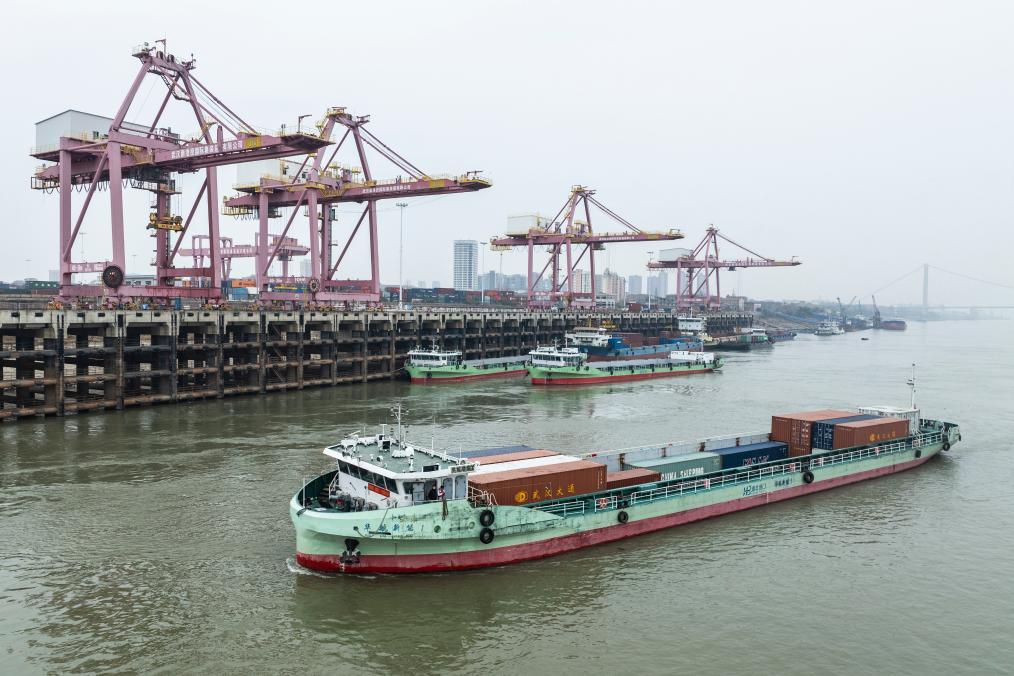 “华航新能1”轮在武汉阳逻港水域靠近停泊(无人机照片)。新华社记者伍志尊 摄
