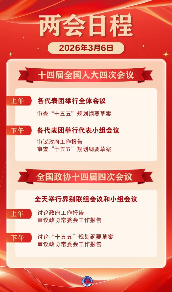 2026-03-05 23:10:00 来源:新华网原标题:两会日程预告丨3月6日:审议和讨论政府工作报告 审查和讨论“十五五”规划纲要草案