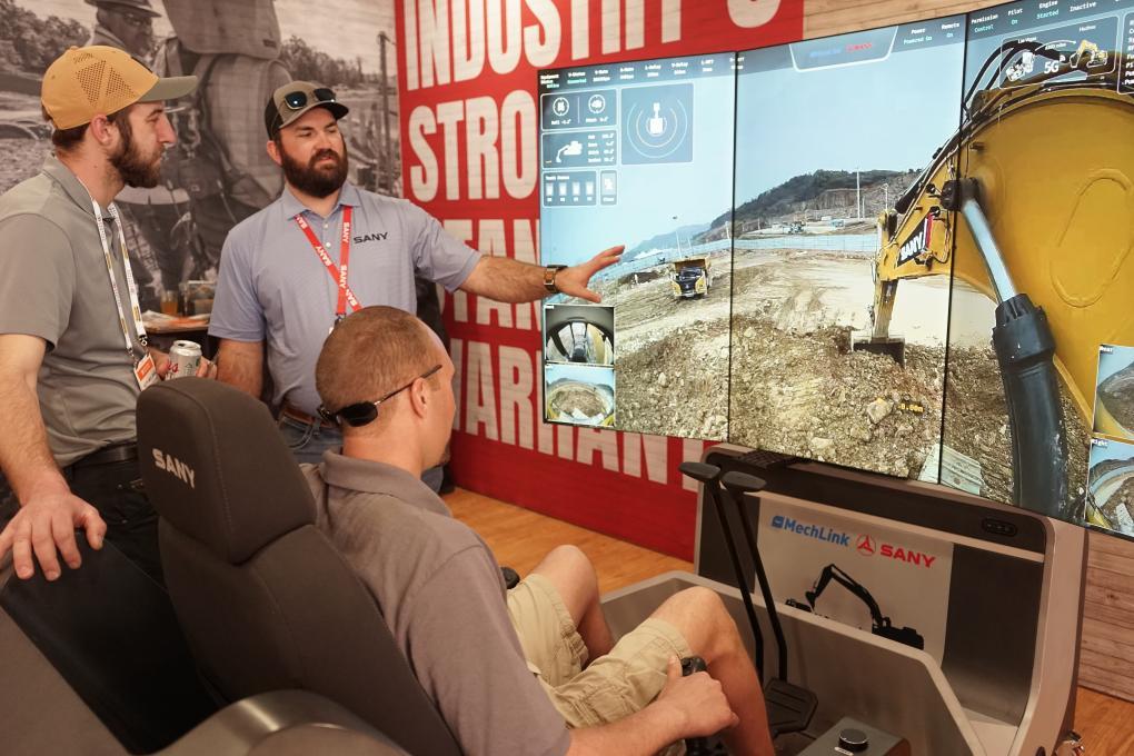 不远处的三一重工展厅,来自加拿大的建筑工人马克·克雷西坐进智能挖掘机器人系统的操作舱,轻推操纵杆,远在浙江湖州矿山试验场的挖掘机铲斗同步起落、回转、挖掘——施工指令通过5G网络和人工智能(AI)算法实时传输。