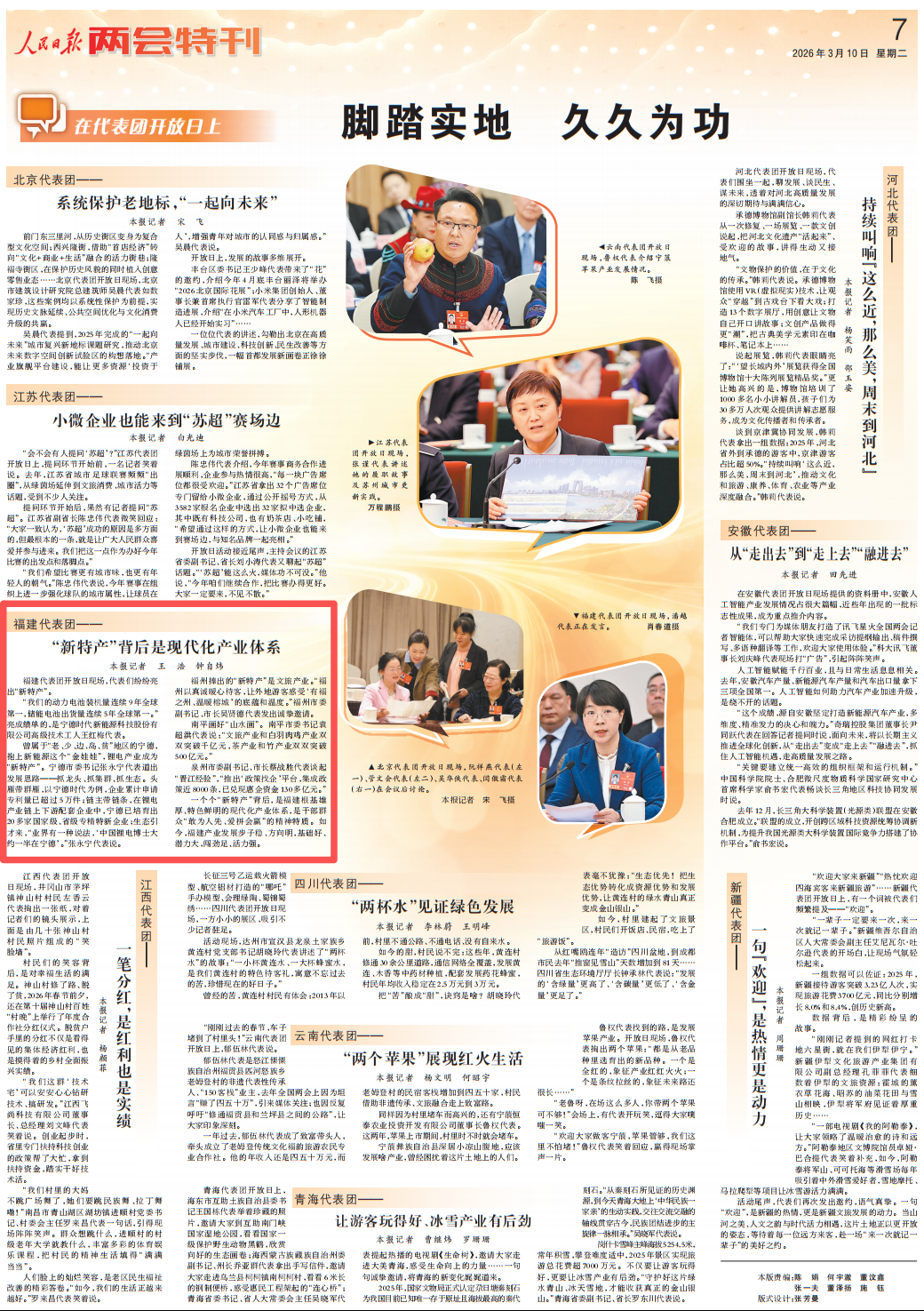 3月10日,人民日报两会特刊7版刊发《福建代表团:“新特产”背后是现代化产业体系》稿件,报道福建代表团开放日。