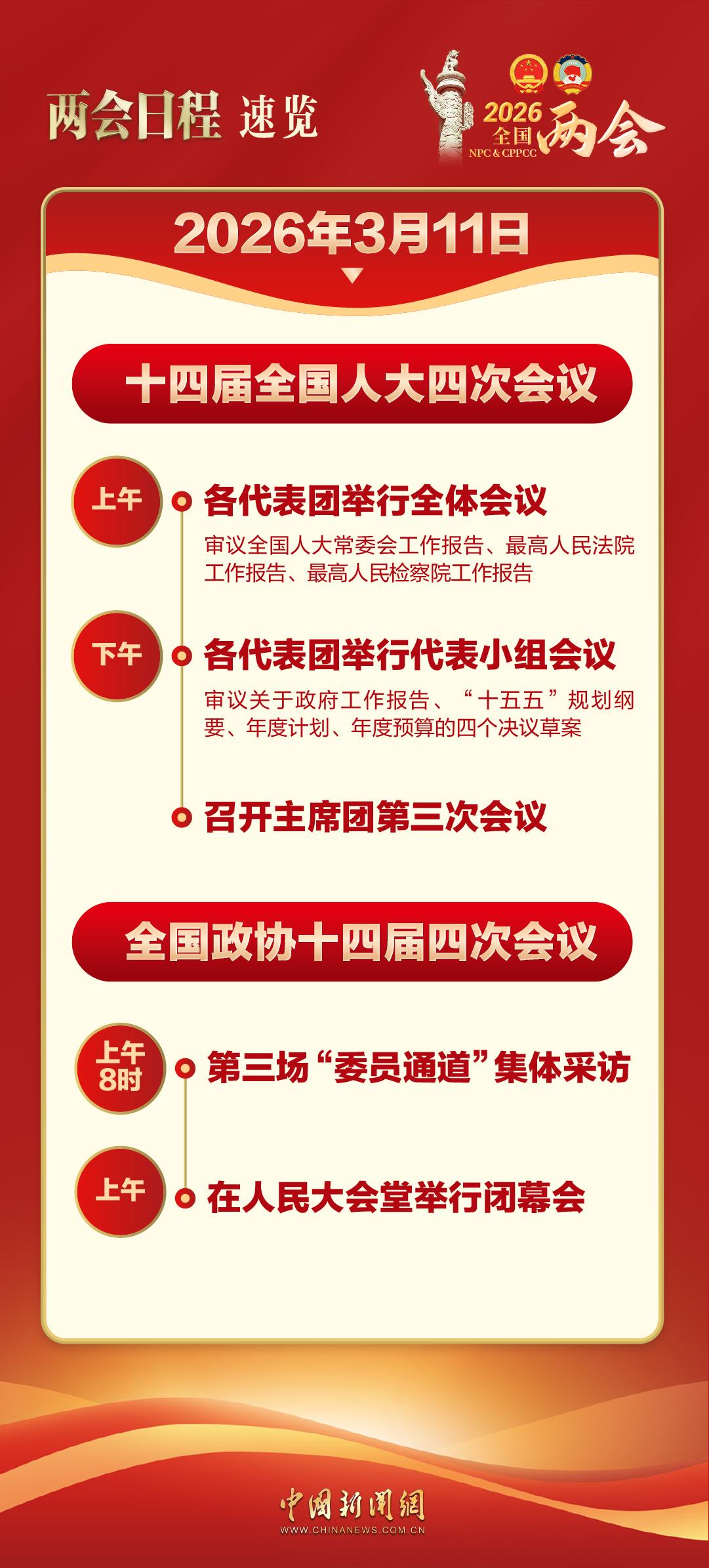 根据已公布日程,11日上午,十四届全国人大四次会议各代表团举行全体会议,审议全国人大常委会工作报告、最高人民法院工作报告、最高人民检察院工作报告。下午,各代表团举行代表小组会议,审议关于政府工作报告、“十五五”规划纲要、年度计划、年度预算的四个决议草案。此外,召开主席团第三次会议。