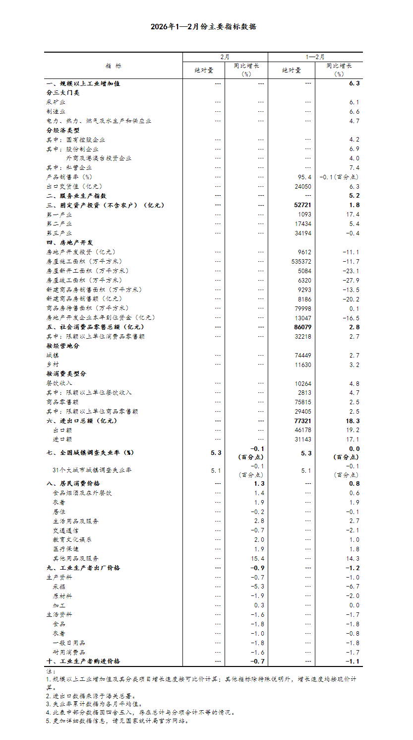 2026-03-16 16:28:59 来源:国家统计局网站原标题:1—2月份国民经济起步有力、开局良好