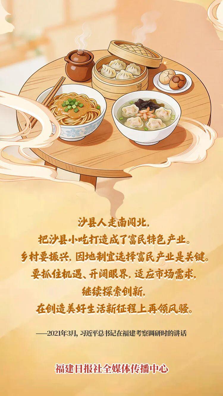 2021年3月,习近平总书记在福建考察时来到沙县夏茂镇俞邦村,同乡亲们亲切交谈,详细了解沙县小吃发展现状和前景。
