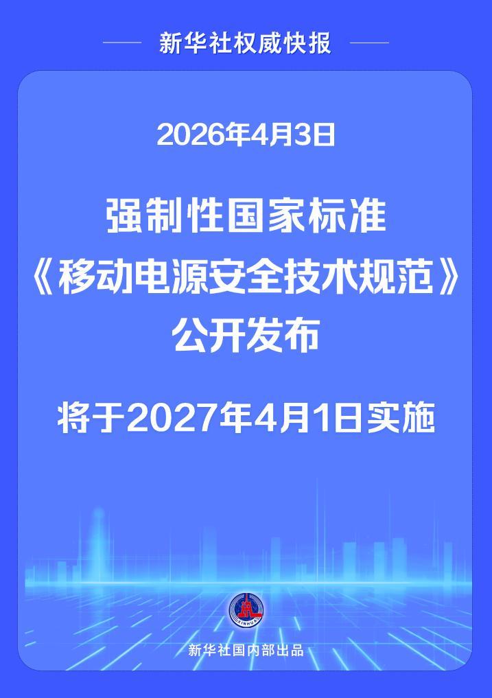 2026-04-03 15:15:54 来源:新华社原标题:新华社权威快报丨全面提升移动电源安全 强制性国家标准发布