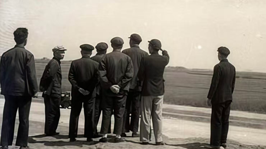 1955年,校长彭康与教授们在西安麦田中踏勘新校址(图片来源:西安交通大学新闻网)