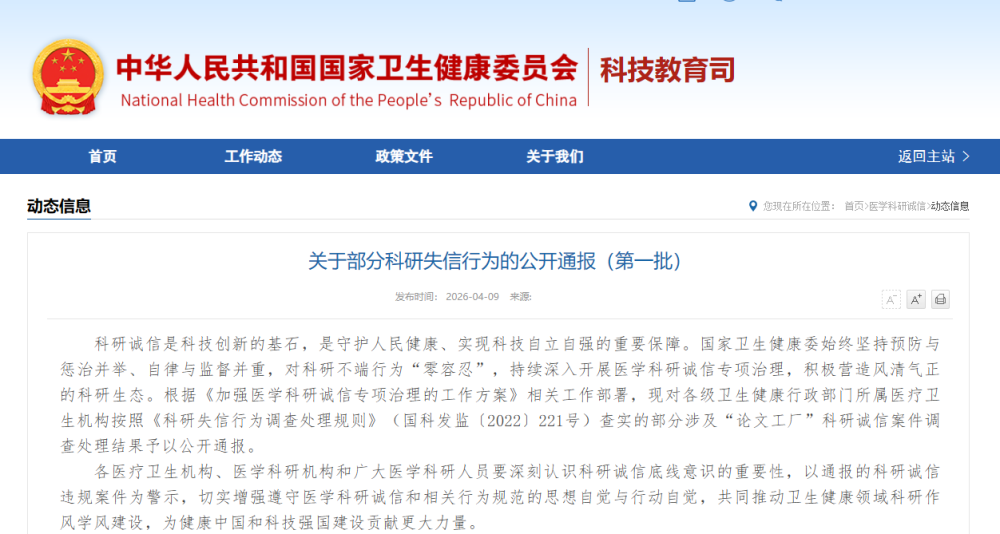 2026-04-10 09:22:16 来源:国家卫健委网站关于部分科研失信行为的公开通报(第一批)
