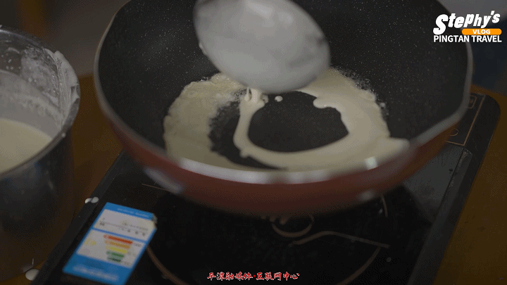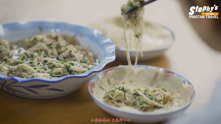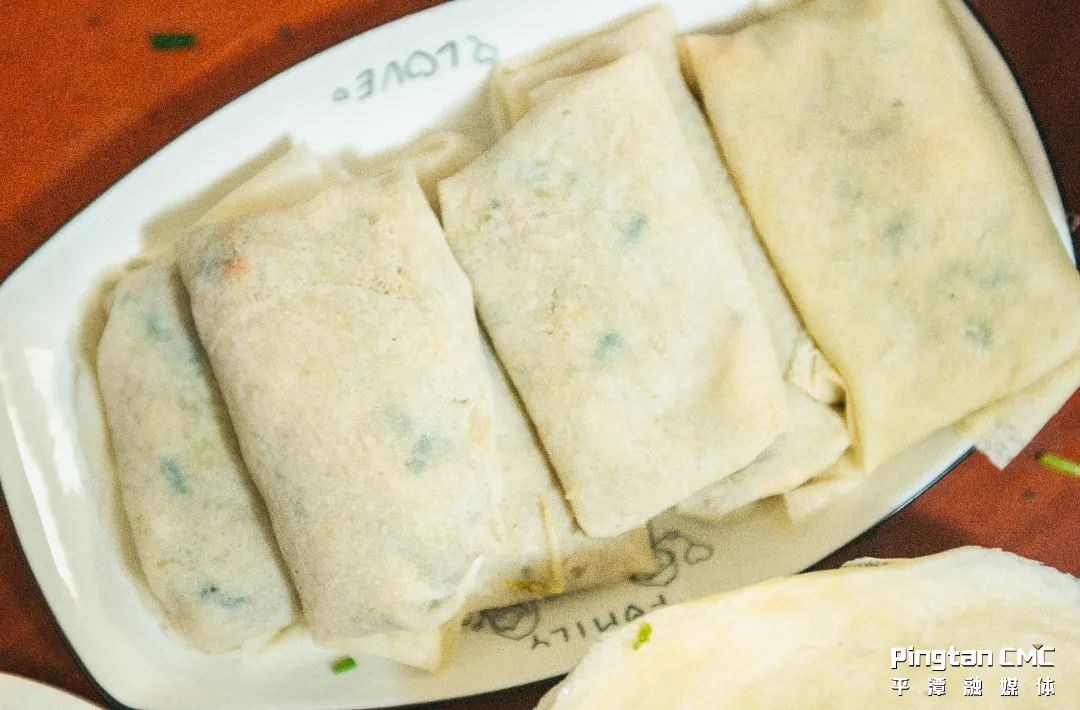 平潭的面饼纯粹用面粉调成稀软的面浆煎,薄而香软。面饼卷上海鲜馅料,才是它的灵魂。传统的面饼馅料需得把紫菜、豆芽、五花肉、蛏子、淡菜或者花蛤肉炒好,控干水分装盘备用。当你摊开煎好的面饼卷上海鲜馅料,再配一碗豆腐海蛎滑粉,这才算是过上了海岛的端午节。