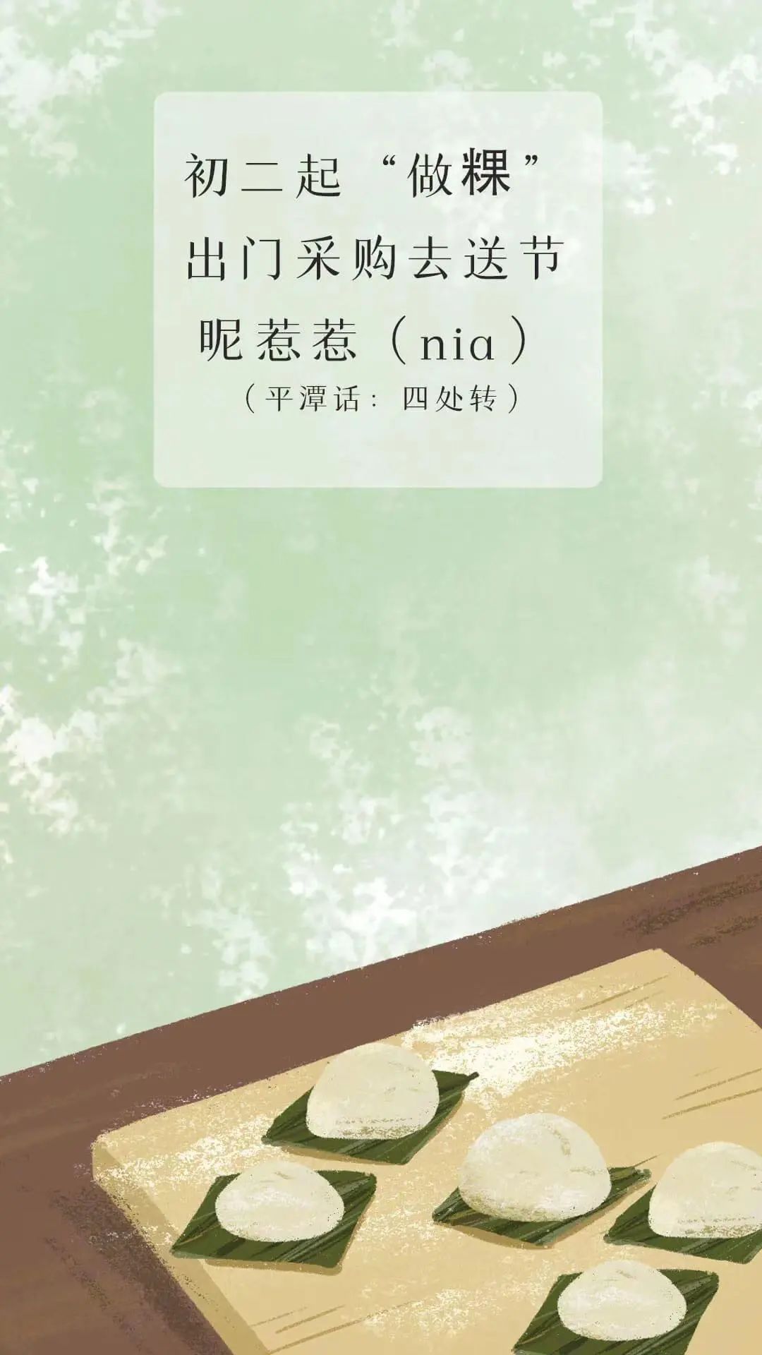 初二浸粿箬。奶奶从院里水井边一丛茂密的艳山姜那裁下一摞叶子,洗净、晾干,接着开始揉面发面,蒸“起家粿”。老家的“起家粿”类似北方的馍,但讲究暄软蓬松,寓意起家发家,粿越蓬家越旺。