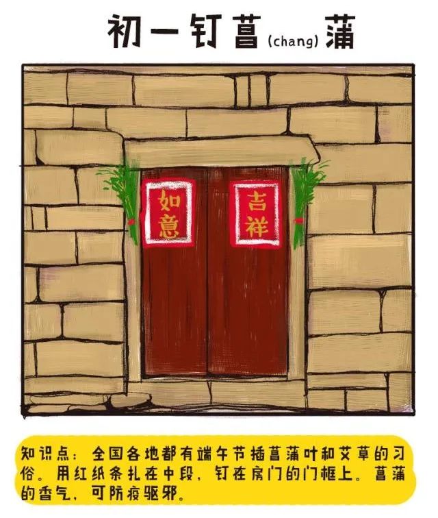初一钉菖蒲。一枝青碧的菖蒲外加几根艾草,用一拃宽窄的大红纸束好,钉在大门门扇上,辟邪驱崇。记忆中老宅的木门被妈妈年年擦洗,灰白细致的木纹清晰可见,比起过年时贴上大红春联的喜庆,端午用菖蒲和艾草、红纸装扮的大门端庄中透着一丝妩媚。