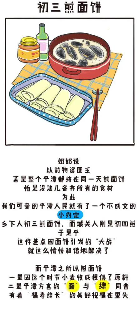 初三煎面饼。新收的小麦,磨成面,调成浆,大铁锅烧热,一根筷子挑一块大肥肉在锅里快速回旋摩擦,滋滋作响,油锅热了,均匀地浇上一勺面浆,摊匀,灶下的火一定不能猛,挑软一点的麦秸秆烘一烘,面饼的四周起边了,两手快速掂起,换一面,煎透。一整个上午,奶奶都在厨房里忙碌着,快速从大铁锅里掂出的面饼在竹匾里越摞越高。