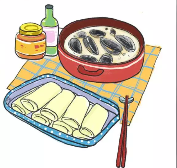 吃面饼时的配汤一般是滑蛏粉汤,因为母亲买了蛏,就顺道用同样的食材做一道汤。汤有点稠,可能是勾了点芡的缘故,很鲜,也咸,下了肚滑且烫呼呼的。我小时候只喜欢煎得酥脆的甜面饼,咬一口甜面饼,配一口汤,味道很奇妙。汤的鲜咸往往在第一刻盖过面饼的甜,咀嚼两下后,面食的醇甜才会透出来。两种食物混杂在口腔里,只变成一种满胀的幸福感和依赖感,只有吃母亲煮的东西时才会有这种感觉。躺在宿舍硬挺的木板床上,我想象着这滋味,只感到嘴里像涨起了潮水,一点点摇晃着淹没,直到把胃填满。
