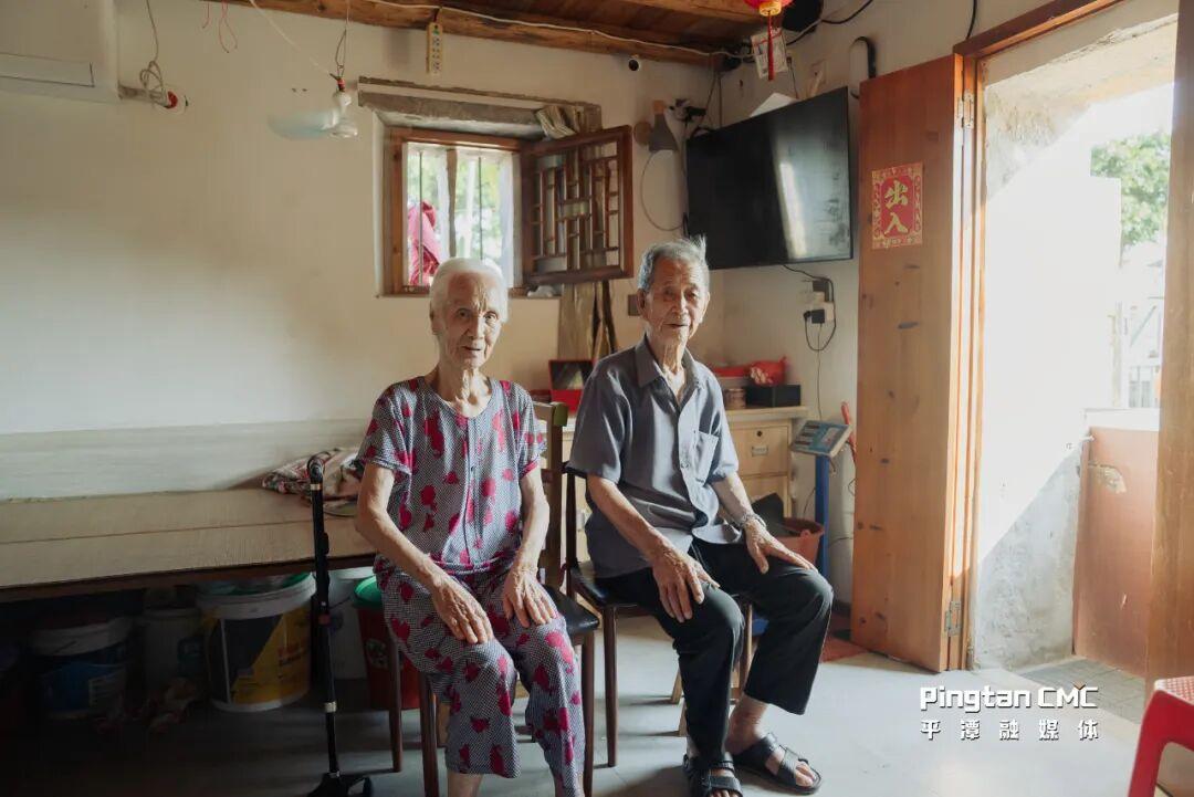 沿着渡口的小径往下辖的官井底村走去,来到了村头一户人家,院门口有一株郁郁葱葱的苦楝树,知了在树上鸣唱,似乎在欢迎不请自来的游客。屋主人是位60岁左右的阿姆,热情地招呼我们进屋坐坐。走进屋内,见到两位慈眉善目的老人家,问起年纪,满头银发的阿嬷林春宋说,她今年90岁,老伴周祖承今年96岁。