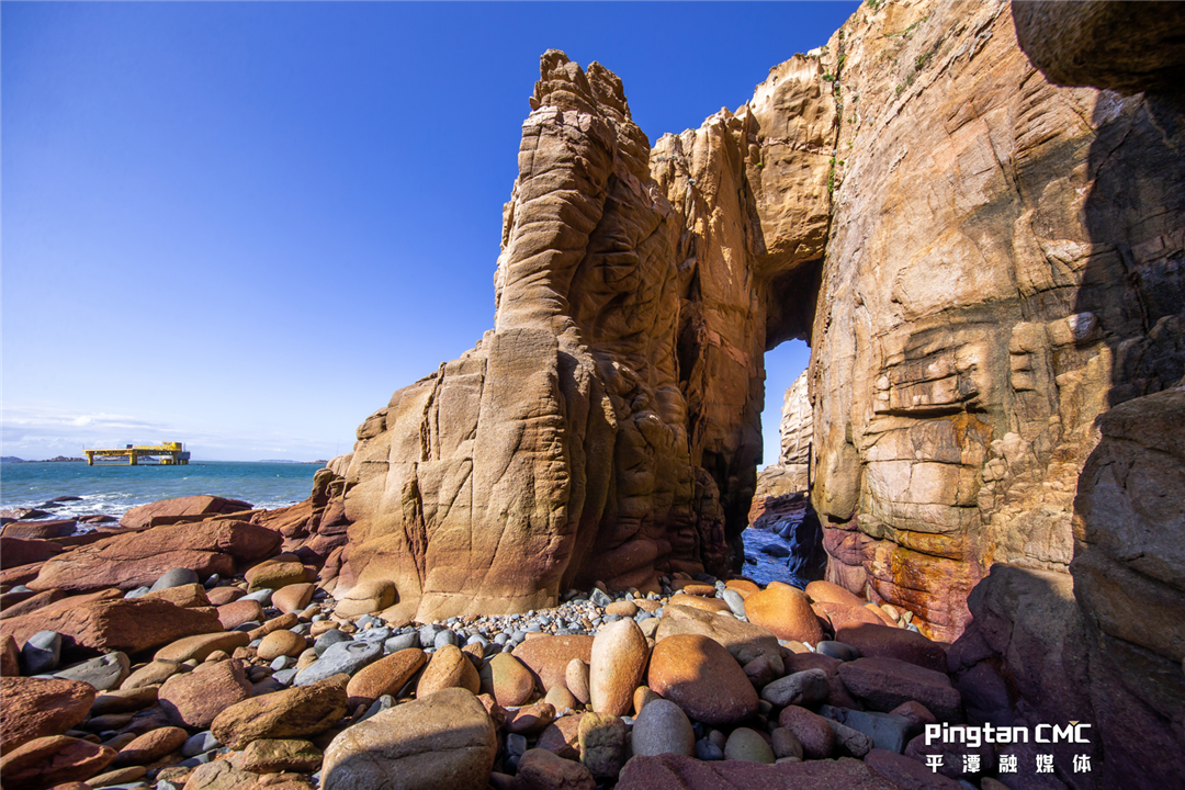 开车到月举村的岭下澳口,就到了大练岛最有名的“通天门”。去的时候刚好退潮,石门整个露了出来。门洞有好几米宽,岩壁上有红、褐、黄、灰几种颜色,岁月在上面留下了斑驳的痕迹。我顺着礁石爬下去,费了不少劲才到门下,坐在那里抬头看,阳光从门洞里倾泻下来,潮水慢慢浸过鹅卵石,轻触脚面,有些凉,很舒服。
