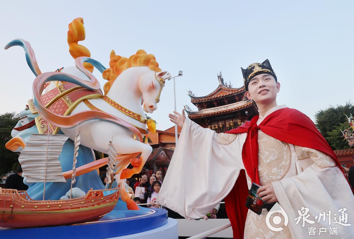 泉州古城马年生肖IP“六合同风马”系列第三款艺术装置、以明代航海家郑和为灵感源泉的“南·乐乐”在德济门遗址广场正式亮相。(王柏峰 摄)