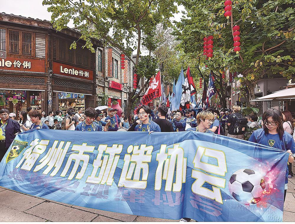 4月11日,“闽超”福州队球迷在福州市上下杭历史文化街区开展球迷助威活动。魏培全 摄