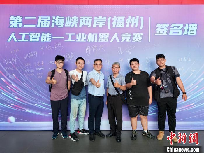 6月13日,福州大学物理与信息工程学院微电子系教授王量弘(左三),台湾工业机器人协会理事长蔡吉胜(左四),与四位“首来族”台生在第二届海峡两岸(福州)人工智能一工业机器人竞赛的签名墙前合影。 (福州大学供图)