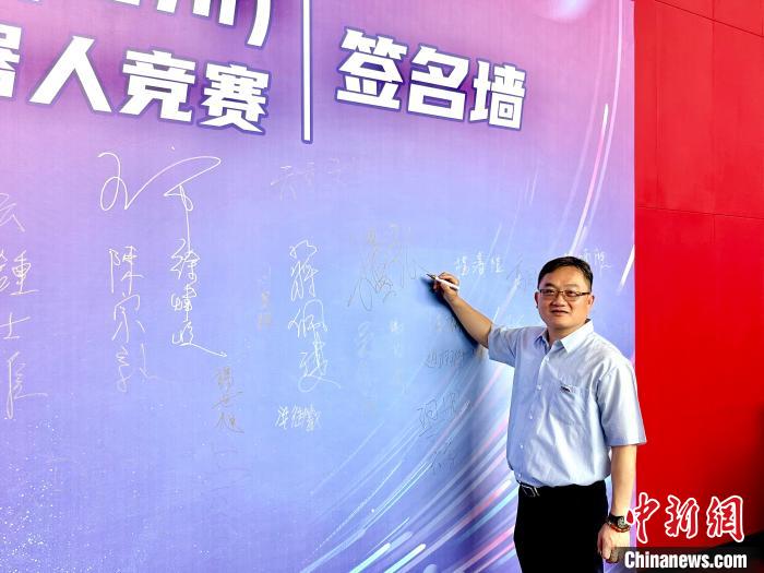6月13日,福州大学物理与信息工程学院微电子系教授王量弘在第二届海峡两岸(福州)人工智能一工业机器人竞赛的签名墙上签下自己的姓名。(福州大学供图)