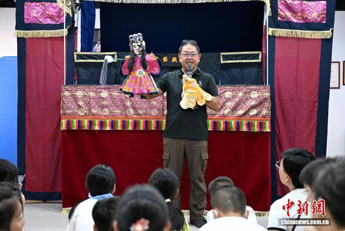 8月18日,“两岸童心—台湾传统文化小课堂” 活动在福州举办,图为台湾布袋戏艺人黄侨伟正在讲解台湾布袋戏。 中新社记者 吕明 摄