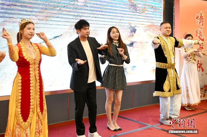 25日,新疆串烧舞《我从新疆来》表演节目中,新疆表演者邀请台胞吴军(左二)登台共舞。 中新社记者 吕明 摄