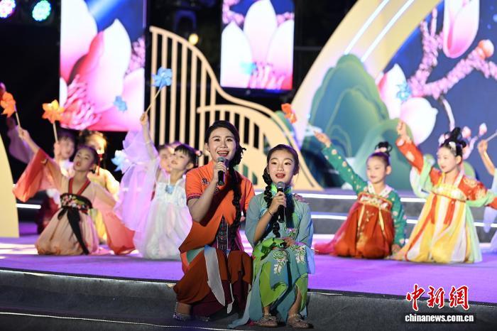 9月28日晚,第六届海峡客家中秋晚会在福建省龙岩市龙津湖公园举行。图为来自梅州的李诗琪(左)和陈思霖演唱新客家山歌《八月十五月光光》。中新社记者 张金川 摄