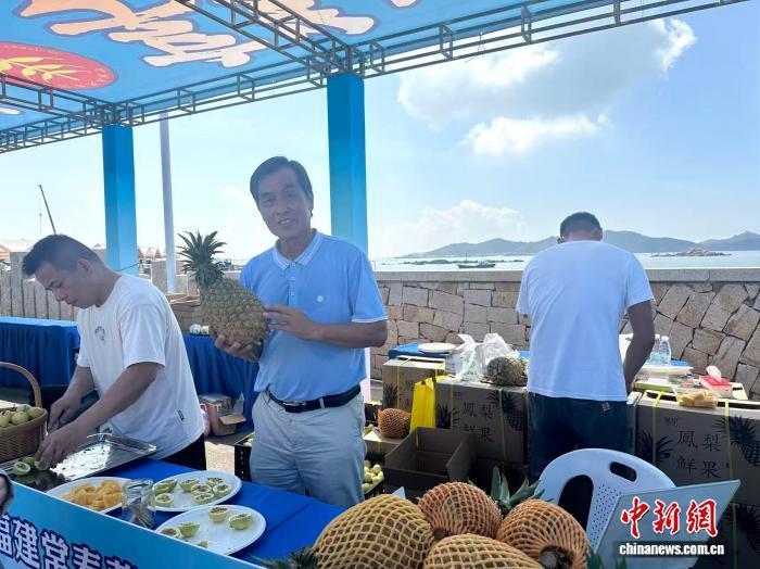 12日,台湾农场主王森谅(中)携特色品种台湾“西瓜凤梨”参加福州市2025年中国农民丰收节福清分会场。 郑江洛 摄