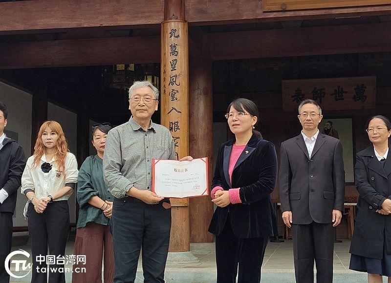 浦江县档案馆为旅台画家任墨蓉女士之子洪其祥先生颁发收藏证书。(中国台湾网发)