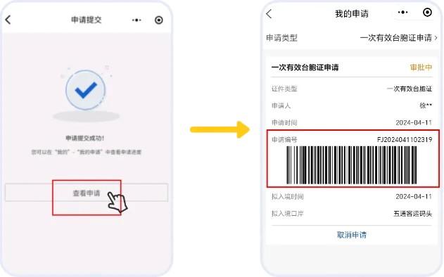 4.申请完成,点击“查看申请”,在“我的申请”界面点击申请类型,选择“一次有效台胞证申请”,即可查看申请信息。