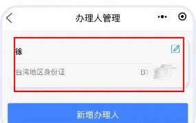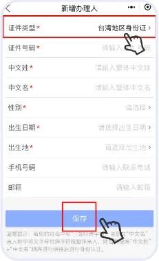 2.在“添加办理人”界面,证件类型选择“台湾地区身份证”,输入办理人的个人信息,其中*为必填项。手机号码和邮箱不能同时为空,可选填其中一个,填写完毕后点击“保存”。