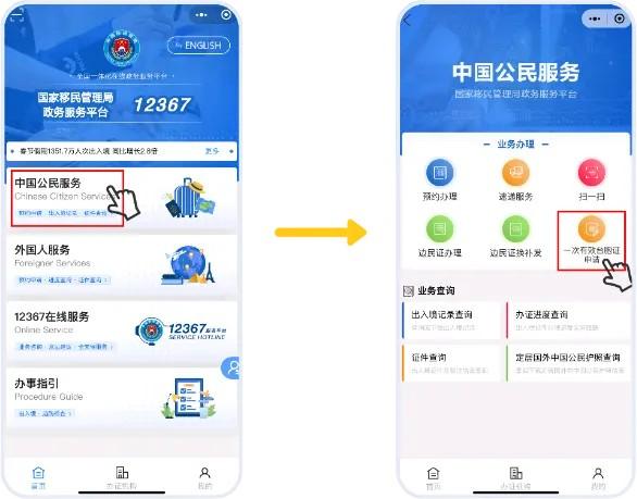 第1步:提前登录“移民局12367”APP或微信、支付宝“移民局12367”小进程