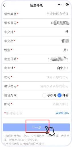 2.“信息补录”界面,填写*必填项,特别提醒“出生日期”请输入公元(西元)纪年,“验证方式”中的“手机号”选项仅支持大陆手机号码,如没有大陆手机号码,可选择“邮箱”方式验证,请立即登录邮箱获取验证码。填写完成后,点击“下一步”。