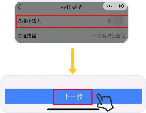 2.点击“选择申请人”,选择办理人,办证类型默认为一次有效台胞证,点击“下一步”。