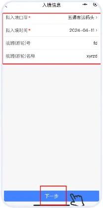 在“入境信息”界面,填写拟入境口岸、拟入境时间及航班(游轮)等信息,填写完成后,点击“下一步”。