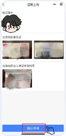2.上传或拍摄办理人有效的台湾地区身份证件及台湾地区出入境证件资料页,完成后点击“确认申请”。
