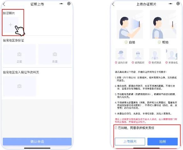 在“证照上传”界面,点击“制证照片”,认真阅读证件照规定后,勾选“已知晓,同意承担相关责任”,选择“上传照片”或者“拍照”。
