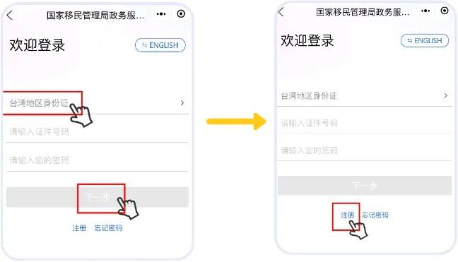 小贴士:曾注册过的台胞,可直接在“欢迎登录”界面的“居民身份证”一栏中选择“台湾地区身份证”,再输入台湾地区身份证号码及账号密码,点击“下一步”登录。