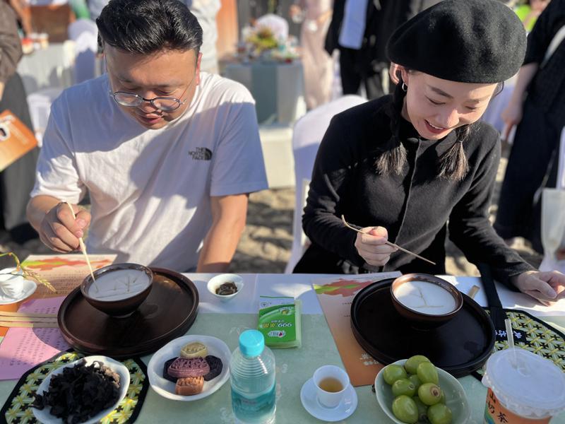 茶会现场以山水为席,特意设置新茶饮、摇青、点茶、茶艺、盲品五大体验项目。青年们或手持醇香的大红袍奶茶,解锁传统茶的青春喝法;或亲手参与摇青工艺,感受茶叶发酵的奇妙变化;或跟着非遗传承人学习点茶技艺,在茶汤上勾勒精美图案;或端坐茶席研习茶艺,体悟“一盏清茗敬知音”的雅致意境;或参与斗茶盲品两岸茶韵,感受台湾茶与武夷茶的独特魅力。