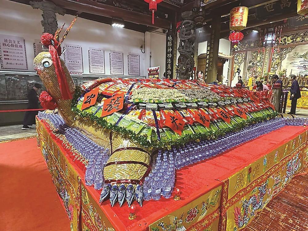 近日,一只由8444公斤大米堆成的巨型米龟在福州上下杭张真君祖殿亮相(如图),吸引大批市民和游客驻足观赏。这是台湾米龟传承工匠团队首次在大陆制作巨型米龟,彰显了两岸信俗文化的深度交融与情感共鸣。