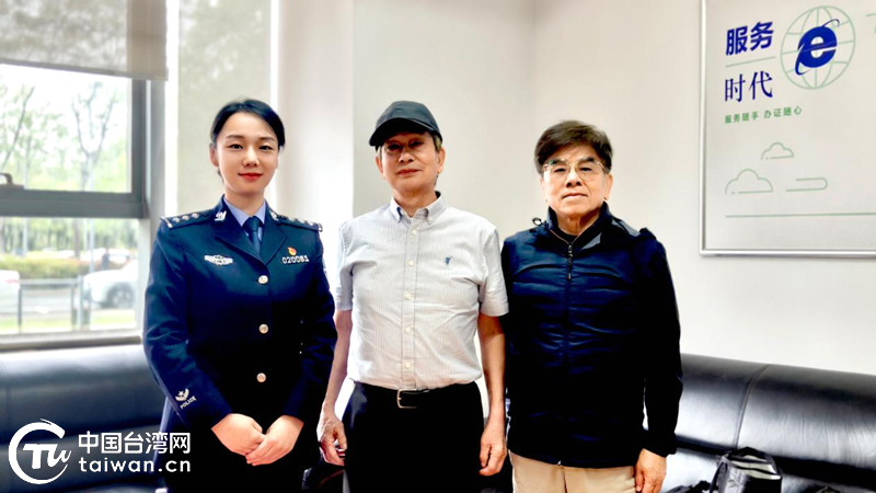 武汉市公安局出入境管理局二大队教导员彭鹏(左)与台胞熊兆中(中)、熊明中(右)兄弟合影。(中国台湾网发)