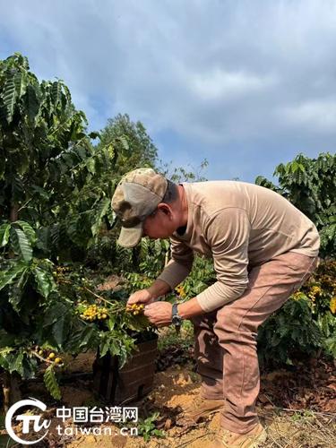 项明祥在观察咖啡苗长势与结果情况。(中国台湾网发)
