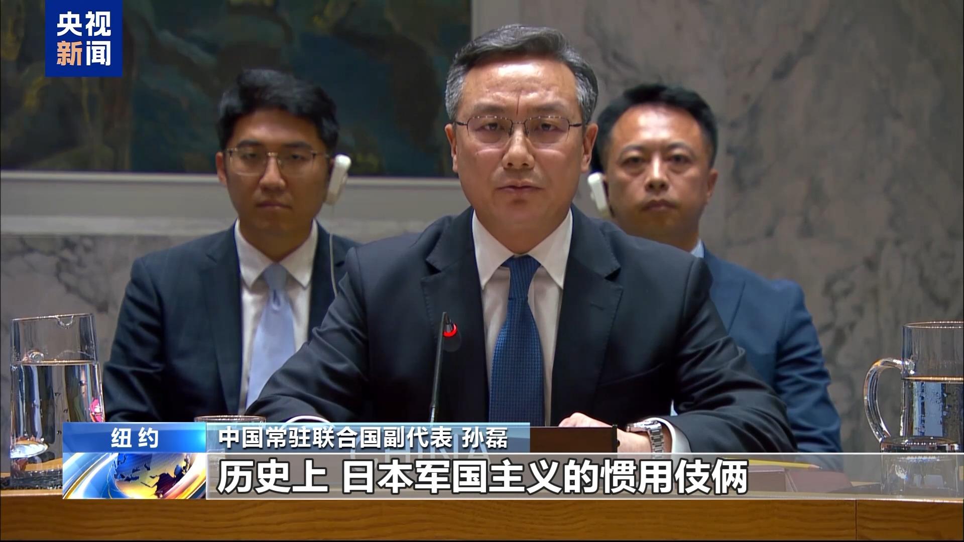 中国常驻联合国副代表 孙磊:历史上,日本军国主义的惯用伎俩就是通过制造外部威胁,煽动民族主义,绑架国家机器,对外发动侵略战争。如今日本右翼势力不但从未认真悔改,反而在涉及中国台湾、二战历史和军事安全等问题上挑衅冒险举动频频。